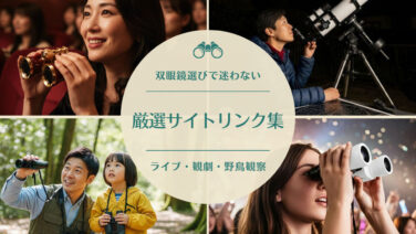 知識・お悩み 【保存版】双眼鏡選びで迷わない!ライブ・観劇・野鳥観察で役立つ厳選サイト12選 「双眼鏡選びで失敗したくない…」そんなあなたへ。ライブや観劇、野鳥観察に最適な一台を見つけるためのヒントがここに。専門家が厳選した12の公式サイトを活用すれば、最高の「見たい」が叶います。まずは信頼できる情報源から始めましょう。 知識・お悩み選び方