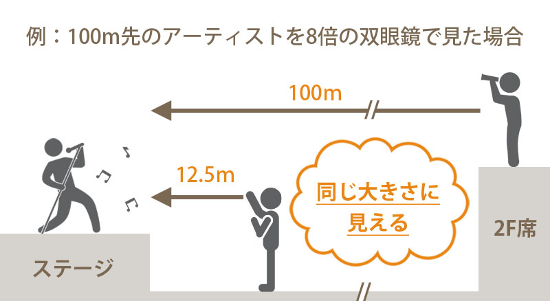 例えば、100m先にあるステージ上のアーティストを8倍の双眼鏡で見た場合は